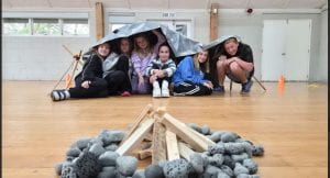 We got called to eat our lunch in the conference room, I didn’t eat much but it was enough. After eating we went into the hall to play a game called leave no trace, and we got into groups 1 and 2. I was in group one with Leila, Tegan, Henry,Elisa, and Saffron. Basically we had to use the materials in the green bin to make a shelter and a fire, we did have to do this inside because the outside was wet. After we had finished we had to make sure we had left no trace at all. We ended up losing because Henry didn’t sweep up the dust from the rocks properly. But they didn’t tie their ropes back up, I still think we deserved to win.